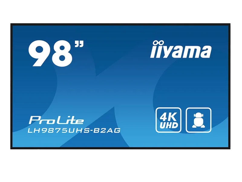 98″ 3840×2160, UHD IPS panel, Haze 25%, 500cd/m², Landscape and Portrait, Signal FailOver, Speakers 2x 10W, Multiple Inputs (DVI-I (VGA), HDMI 3x), DP-out (MST/Mirror/Tiling), USB 2.0 x2, WiFi, LAN, Media Play USB Port, Control LAN / RS232C, iiSignage2 (CMS/DMS), E-Share, Android 11 OS, file- and web browser, PC-SLOT OPS, 24/7 Operation, VESA Mount 800×600 – wallmount included