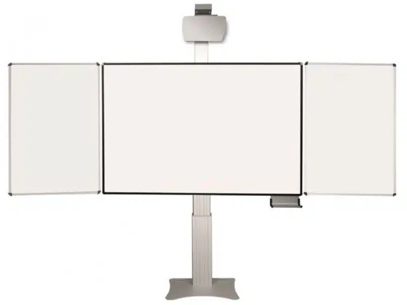 – die Whiteboardtafeln sind magnethaftend ausgeführt, beschreibbar, Boardmarker abwischbar und per Knopfdruck elektrisch höhenverstellbar