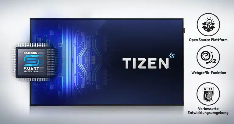 Für den direkten Kontakt zum Kunden ist das Samsung PM55F-BC Display die überzeugende All-in-One Lösung. Denn Sie können ihre digitalen Inhalte mit der unwiderstehlichen Anziehungskraft des Touchscreen-Displays verbinden und so einmalige Erlebnisse für Ihre Kunden schaffen. Mit der kapazitiven Touch-Technologie werden bis zu 10 Berührungspunkte gleichzeitig erkannt. Wodurch eine interaktive Nutzung von mehreren Usern gleichzeitig möglich wird. So entstehen einzigartige und komplexe Kundenansprachen. Das All-in-One Paket beinhaltet einen integrierten Media Player sowie ein Content Management System zur leichten Organisation Ihrer Inhalte. Darüber hinaus benötigen Sie für den Betrieb des Samsung PM55F-BC keine externen PCs oder andere Geräte, da das leistungsstarke Betriebssystem Tizen bereits integriert ist. Das Tizen erzielt nahtlose Übergänge in der Wiedergabe Ihrer Inhalte sowie eine bestechende Grafikperformance. Durch den zentral platzierten Infrarot Receiver ist die Kontrolle des Displays einfach und flexibel von nahezu jedem Standpunkt aus möglich.