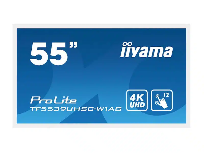 55″ PCAP WHITE Anti-glare Bezel Free 15-Points Touch Screen, 3840×2160 (4K), IPS panel, 24/7 operation, 2xHDMI, DisplayPort, VGA, 500cd/m², 1100:1, Landscape, Portrait or Face-up mode, Through Glass (Gloves) supported, USB Touch Interface, LAN & RS232C control, VESA 600x400mm, MultiTouch with supported OS