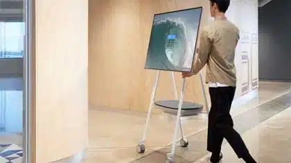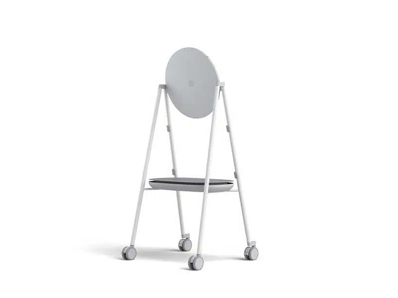 Das Design des rollbaren Ständer für das Surface Hub 2S lässt jede technisch graue Eckigkeit vermissen und sieht das sich vor als Raumobjekt, dass nicht mehr hinter der Schiebewand oder im Technikraum versteckt werden muss.