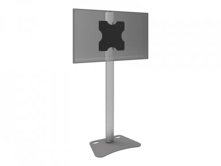 Designständer für Displays bis zu 65 Zoll, welcher höhenverstellbar und vollständig teilbar ist über 1 Kabelkanal verfügt und mit einer silber-Optik daherkommt. Der Fuß ist hierbei schwarz.