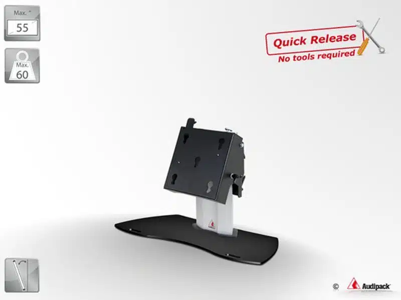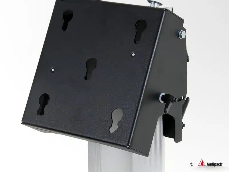 Schrägsteller bis 55 Zoll – Audipack 900 mieten – Dieser Display-Schrägsteller eignet sich für alle gängigen Displays bis zu 55 Zoll und 60kg. Die Installation ist kinderleicht und bedarf keiner weiteren Werkzeuge, etc. Das integrierte Sicherungssystem verhindert jedoch gleichzeitig ein ungewünschtes Verschwinden Ihrer Bildschirme. Der 27kg schwere Ständer kommt in dezentem Schwarz / Aluminium daher und ist somit für repräsentative Anlässe bestens geeignet.