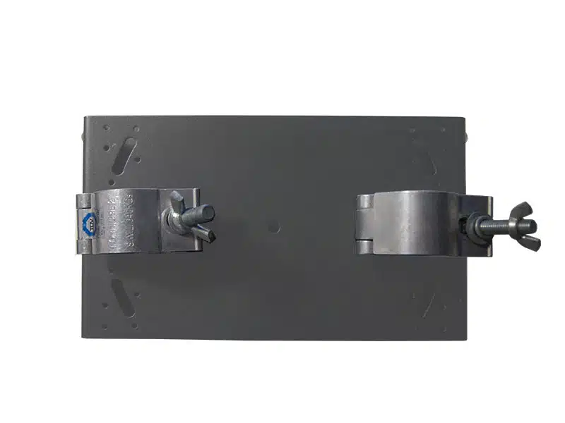 Displayhalterung L&S3 für Traversen mieten – Um Displays auch an Traversen ansprechend, sicher und repräsentativ zu befestigen, bedarf es dieses Produkts. Hierbei handelt es sich um eine Displayhalterung, welche in diesem Fall über Schellen zur Trussmontage verfügt (29cm).