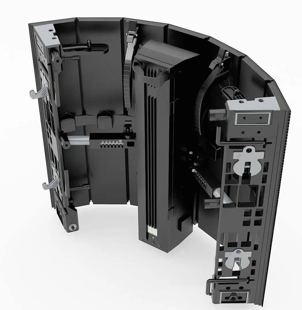 Möglich wird die Konstruktion durch sB5 Flex Module von LEDitgo. Diese sind in 13 Stufen konvex und konkav in einen Winkel von bis zu 45° verstellbar und ermöglichen dadurch auch runde Formen, wie zum Beispiel den LED-Kreis. Herkömmliche LED-Module haben diese Fähigkeit nicht und können dadurch keine organischen Formen bilden. Die Module leuchten mit bis zu 5500cd/m². Die Maße eines einzelnen Moduls betragen 50x50cm bei einer Tiefe von gerade einmal 11,6cm. Durch das Fast-Lock-System sind die Module schnell und sicher miteinander verbunden.