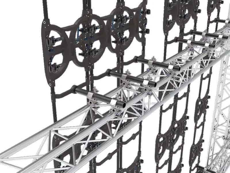 Die Module von Unilumin verfügen bei einer Größe von 100 x 50 x 11,8 cm mit Touring Frame über eine Auflösung von 84 x 186 Pixeln, das entspricht einem Pixelpitch von 5,9 Millimetern. Module und Touring Frame entsprechen den Standards der Schutzklasse IP65 und sind damit vor Wind und Wetter gut geschützt. Einem Einsatz im Außenbereich steht also nichts im Wege. Auch großflächige Konstruktionen im Außenbereich sind bis zu einer Höhe von 13 Metern möglich. Und auch die Versteifung des Systems ist durch die Schnellaufnahme am Touring Frame für die Back Brazing Pipe im wahrsten Sinne des Wortes im Handumdrehen erledigt. Kreativ wird es mit den UpadⅢH durch die Möglichkeit konvexe und konkave Formen bis 15° zu realisieren. Auch im Design des Touring Frames wurde dies mit berücksichtigt, sodass Sie auch hier Nichts aufgrund der Praktikabilität an Möglichkeiten der Montage einbüßen.
